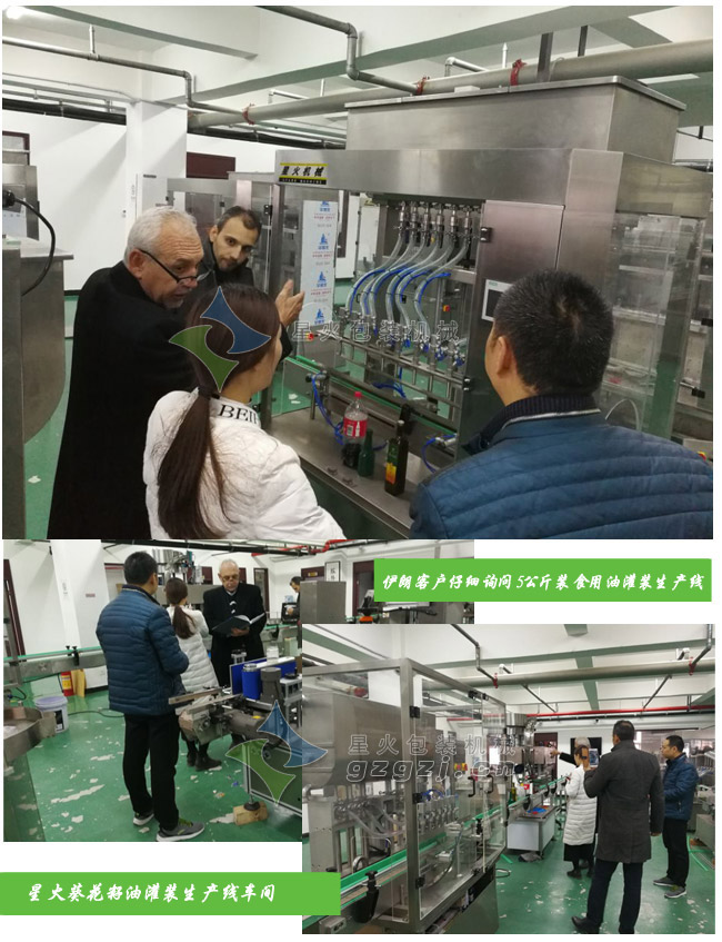 目前市面上常見的食用油包裝多數(shù)是5L即5公斤包裝的,我們星火包裝機(jī)械也專門推出了針對(duì)5L裝食用油的灌裝生產(chǎn)線設(shè)備,這條灌裝生產(chǎn)線有灌裝機(jī)-壓蓋機(jī)-貼標(biāo)機(jī)-噴碼機(jī)等設(shè)備組成,一上市就受到廣大油類生產(chǎn)商的追捧,伊朗的客戶再經(jīng)過電話簡(jiǎn)單了解之后也專程來(lái)到我們的車間參觀并進(jìn)行了詳細(xì)的咨詢