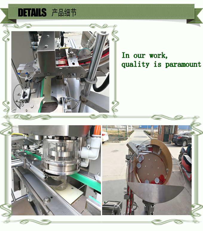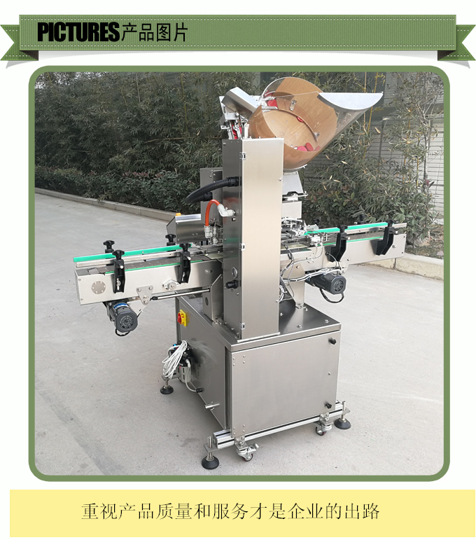 自動真空旋蓋機機是我司多名具有豐富經(jīng)驗的高級工程師研發(fā),集自動理蓋、上蓋、自動抽真空旋蓋于一體,手用真空泵抽真空的方式,可獲得很高的真空度。具有無瓶不送蓋,缺蓋自動報警功能,自動化程度高,主要氣動及電器元件采用國際知名品牌,性能穩(wěn)定可靠,廣泛適用于食品罐頭、飲料、調(diào)味品、保健品等行業(yè)中玻璃瓶、馬口鐵蓋的真空旋蓋。